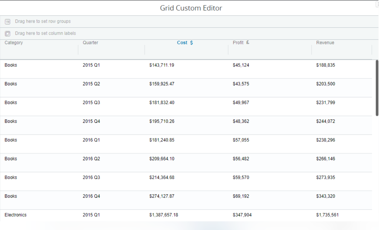 Assume you’re creating a financial performance dashboard to display quarterly sales statistics. Instead of presenting plain numbers, you decide to use Grid’s versatility and the formatting features of the custom editor to improve data clarity and presentation.