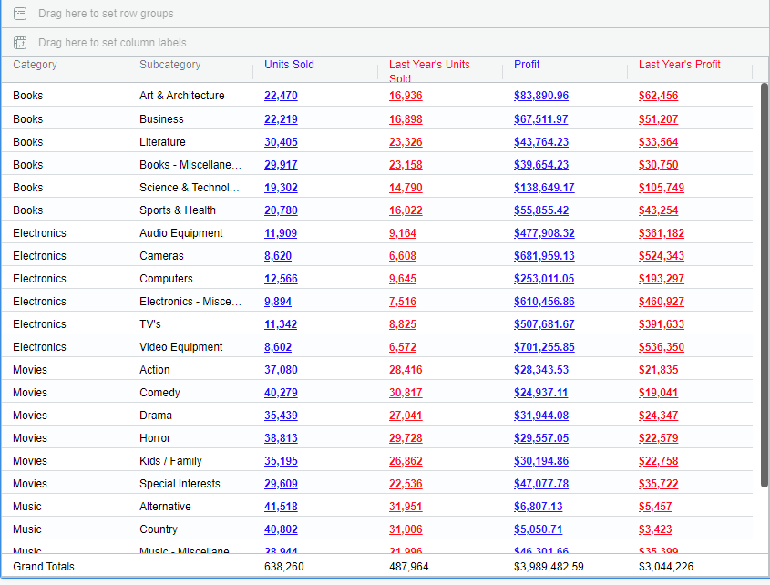 In the below screenshot vitara grid chart is displaying the data for current year Profit, last year’s Profit, current year Units sold and last year’s Units sold.