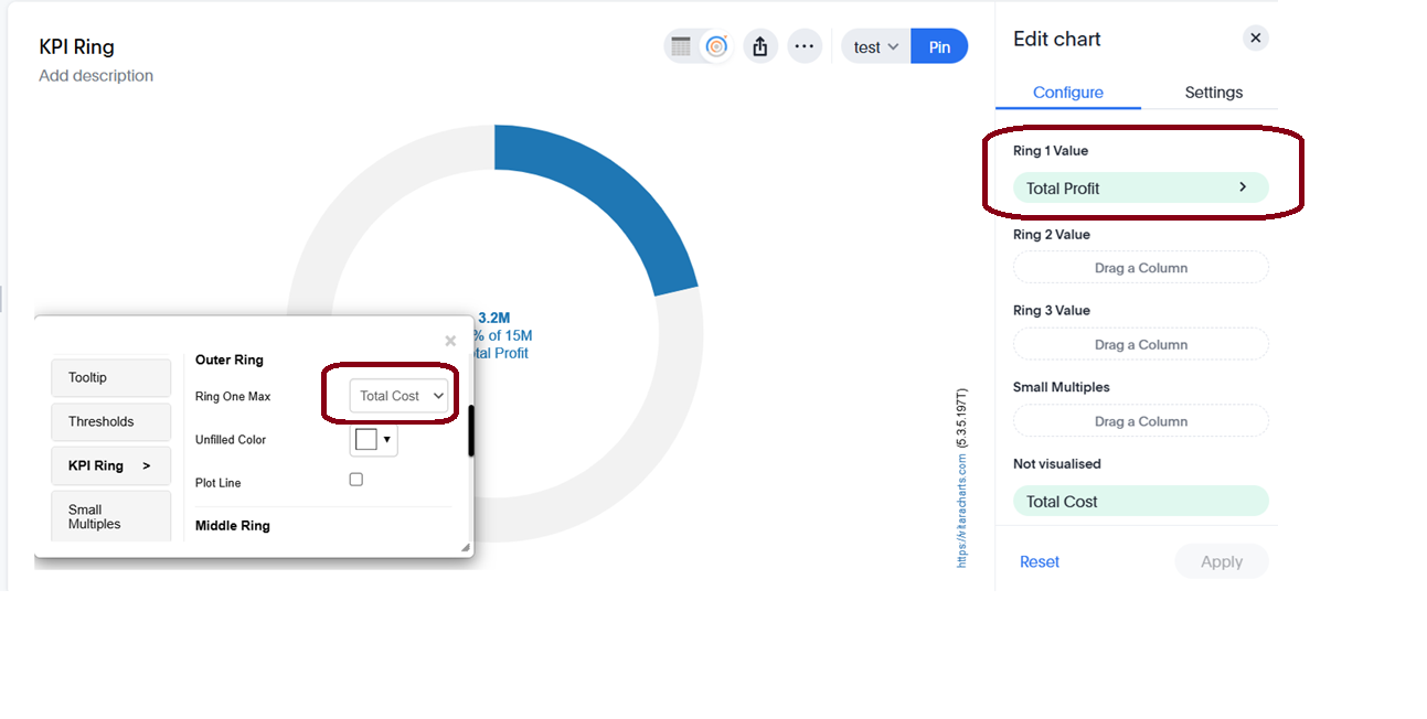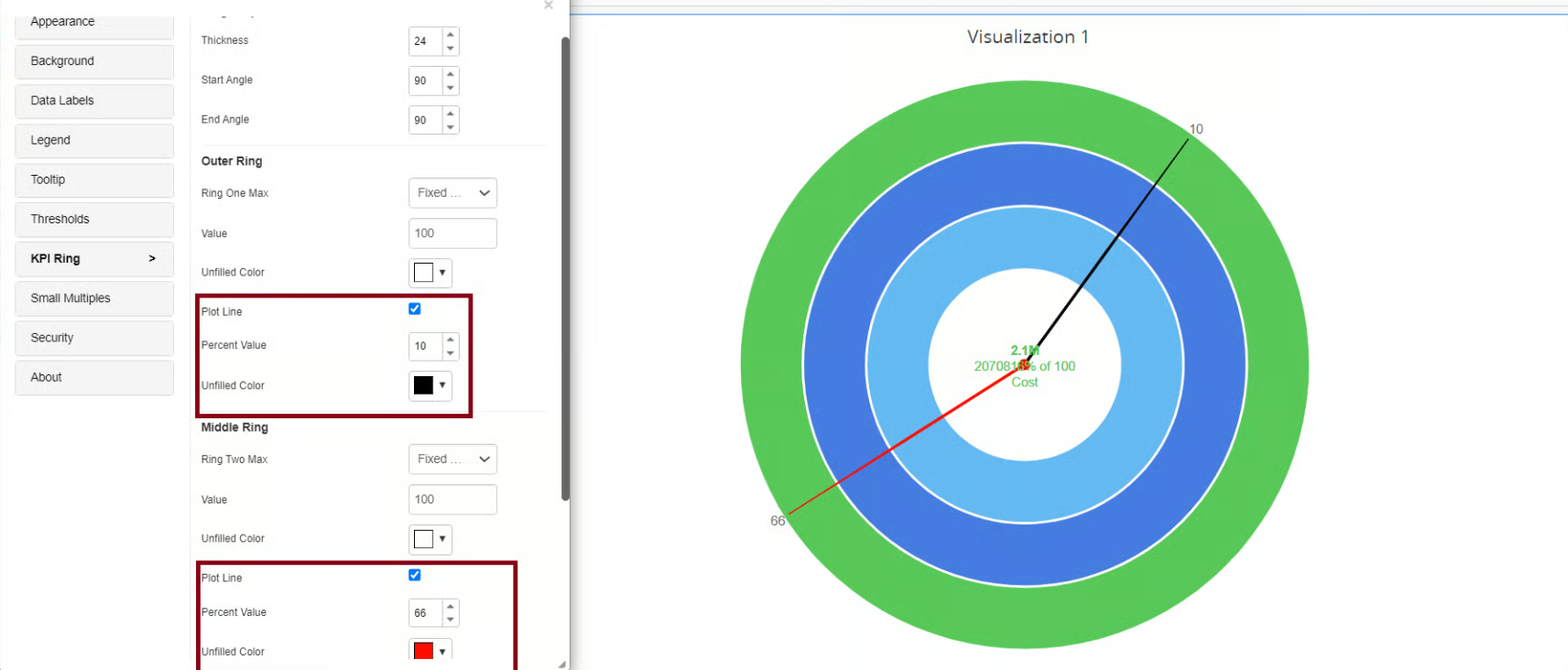 The plot option has been introduced to the ‘Kpi’ property in the editor panel . After clicking on it, it will display the default line as per the series(Ring) max value, for user has been given input text which will have range from 0 - 100 as a percent value, user may define value in it so line will appear as a user value, and user can also apply color on it.