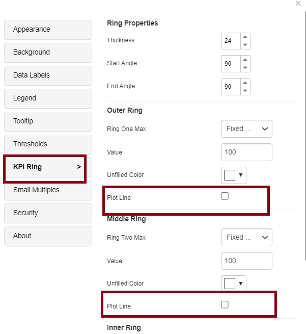 A new feature is added in KPI Ring which helps to set the **Ring thickness, start and end angles** and **Unfilled ring color**.\