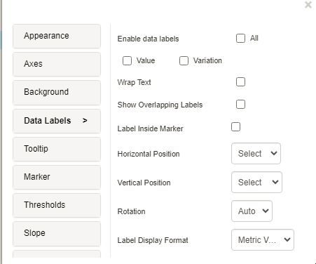 We can now display data labels inside the marker . A slope chart’s readability and clarity can be improved by adding labels inside the markers by directly connecting the values to the corresponding data points. Viewers can more easily recognize and relate data points to their relevant categories by using labels inside markers. This is particularly helpful in slope charts, where the comparison of changes between two points for various categories is the main focus. This functionality can be enabled by going to the editor’s data labels property and checking the “Label inside the marker” check box.